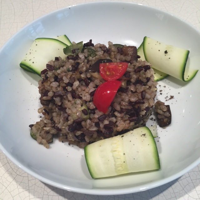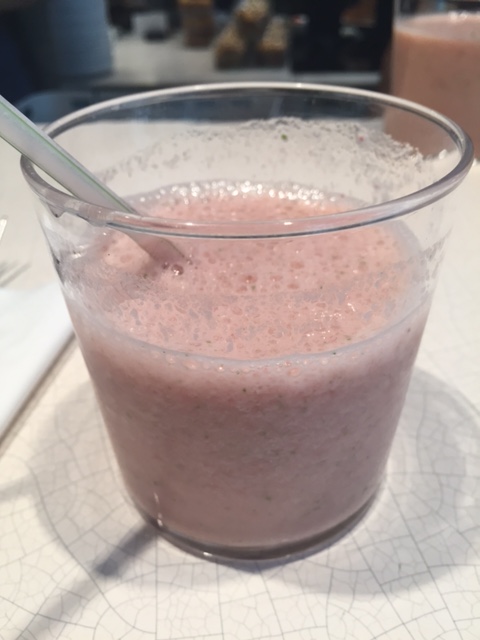 Je m’installe au comptoir et je commence par un délicieux smoothie fait devant moi puis je choisis le plat du jour : le riz « Pinson » : Riz complet et thaI noir sauce ortie, tagliatelles de courgettes et légumes poêlés. Miam. Ca passe tout seul. Je termine par un machiatto au lait d’amande accompagné d’un mini quatre-quarts maison.