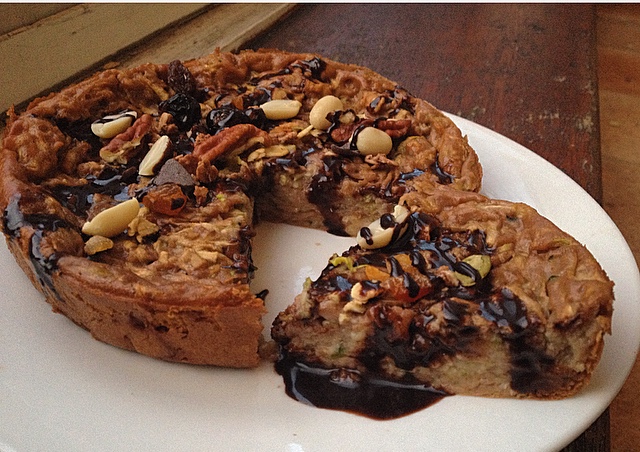Oui, oui, encore un gâteau avec la même base. Oui, mais je suis sûre qu’elle marche bien, et qu’elle fait une portion suffisante pour un petit-déjeuner (alors que j’ai vraiment TRES Faim.) Mais pour celle là, pas de fruits: on essaye le mélange chocolat-courgette. La courgette sert surtout à donner du volume, le gout est très léger, et fait ressortir celui du chocolat 🙂