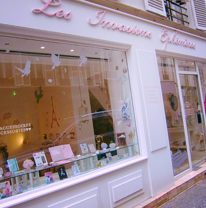 Les Invasions Ephémères est une marque qui s’est d’abord fait connaitre pour ses stickers muraux, mais font proposent également des accessoires décoratifs et accessoires de mode. La directrice artistique se nomme Sofia Antonovich. L’univers est très doux, féminin, rose, parisien. Moi j’adore. La boutique est super jolie on a envie d’y entrer.