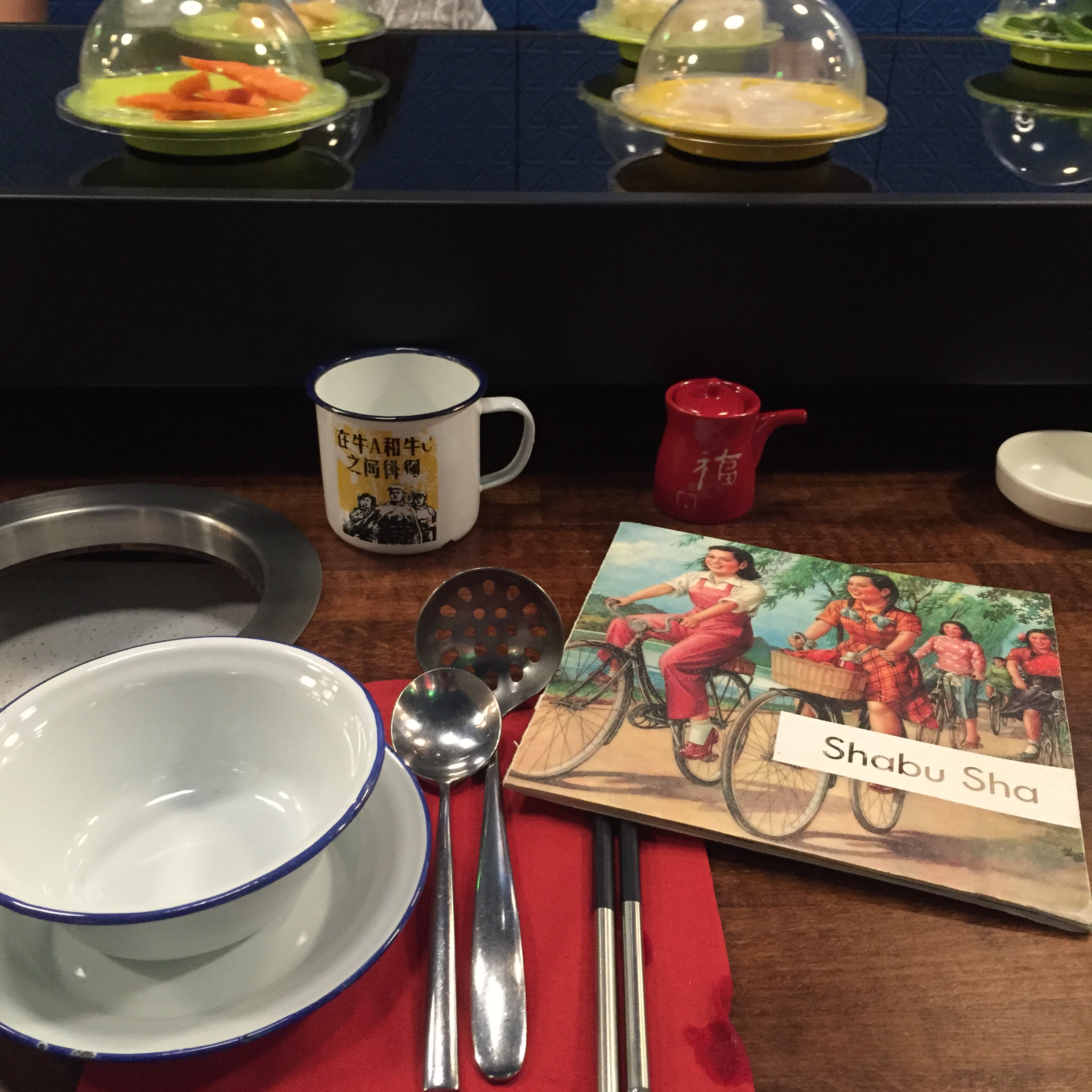 C’est rue des Gravilliers dans le 3ème, que se situe Shabu Sha. Le concept c’est la fondue japonaise et à volonté. Une décoration assez originale et colorée, asiatique mais pas clichée (la déco aurait été faite par le décorateur de l’hôtel Jules & Jim) et le lieu est assez convivial. Un très grand comptoir ou défilent les portions vous attend. Mais il y a aussi une petite salle au fond avec une table plus grande ou l’on peut diner à plusieurs.
