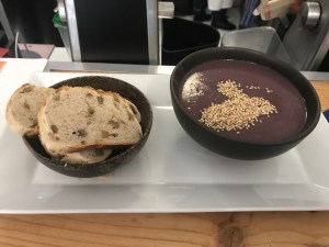 Et après le cours direction le bar 🙂 Nous étions attendus avec des shots de jus fraichement pressés à froid. C’est pas beau tout ça ? Puis la jolie salle lumineuse qui offre une belle vue sur la place et l’église invite à rester encore un peu pour se restaurer, chiller, se détendre.