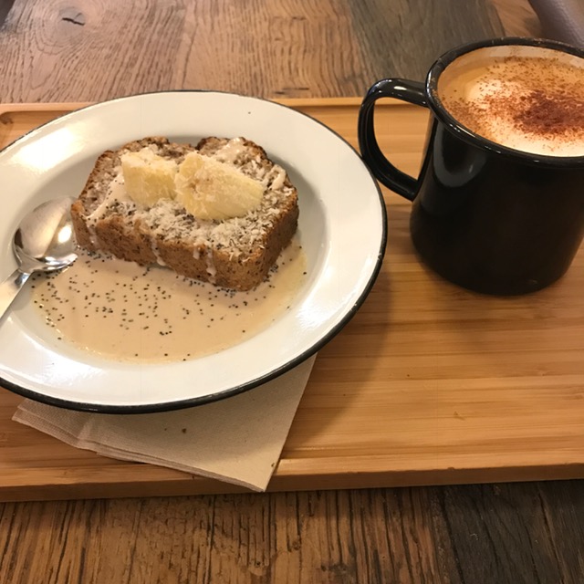 On mange sain ! J’ai testé des tartines crues à base de graines accompagnées de houmous maison. Un petit jus énergétique baptisé « The Tiger » et pour finir un Banana Cake 100 végan (exquis) et sa crème au lait de coco accompagné d’un très bon latte. On commande au comptoir et on attend que le sympathique serveur vous apporte votre commande.