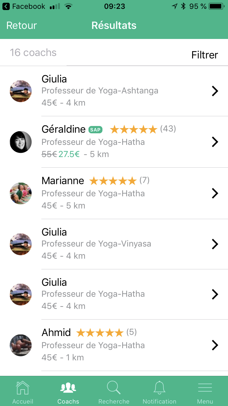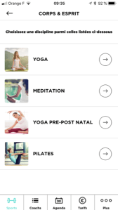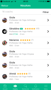 L’application est plutôt claire, bien que je ne la trouve pas réellement super sexy. L’avantage et que l’on peut vraiment trouver rapidement ce que l’on souhaite. On choisit : date, heure, type de coach (ici professeur de yoga), si l’on souhaite un homme ou une femme, quel tarif maximum et enfin, si l’on souhaite un professeur agrée SAP (ce qui permet une déduction fiscale de 50%).